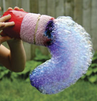 Arco iris de pompas de jabón Necesitas: una botella vacía, banda elástica o de goma, una media que no tiene par, jabón para lavar platos y colorantes para alimentos. Cortamos el fondo a la botella, colocamos la media y aseguramos con la bandita a la botella. Agregamos un chorro de jabón en un recipiente, luego el agua y mezclamos; los colorantes los podemos poner en el recipiente con el agua o en el extremo de la media. Sumergir la media en la solución y soplar suavemente. ¡Recuérdele a los niños que soplen hacia afuera, no que aspiren!