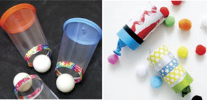 Lanza y emboca pelota Podemos usar vasos descartables o los rollos de cartón de papel higiénico. A los vasos le quitamos el fondo; en ambos casos, colocamos en una de las extremidades un globo pequeño, pegamos con cinta, hacemos un nudo del cual vamos a tirar propulsando la pelota que debe ser liviana. Decoramos a gusto.