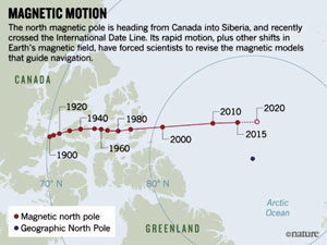 El polo vaga en formas impredecibles que han fascinado a los exploradores y científicos desde que James Clark Ross lo midió por primera vez en 1831 en el Ártico canadiense. A mediados de la década de 1990, aumentó su velocidad, desde alrededor de 15 kilómetros por año hasta alrededor de 55 kilómetros por año.