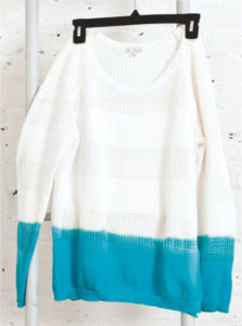 Llena medio cubo con agua y añade el tinte siguiendo las instrucciones del producto. Cuelga tu suéter de la percha para mantenerla vertical y así asegurarte de que la prenda se tiña de forma nivelada. Introduce la prenda en el cubo hasta cubrir toda la parte deseada. Dejala sumergida durante un par de minutos en el tinte. La sacas y si te parece demasiado claro puedes introducirla un par de minutos más. Hay que tener en cuenta que el color en mojado siempre parece más intenso que al secarse. Cuando haya adquirido el color que deseas la sacas y la cuelgas para que se seque. Antes de usarla lávala a mano con agua fría.