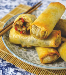 Los rollitos primavera, arrollados primavera o chun kun, pueden ser elaborados con diversos rellenos como verduras, carne, pollo o pescado. Comienza por lavar bien todas las verduras y cortarlas en tiritas finas. Lo ideal es saltearlas en un wok, si no tienes, puedes usar una sartén. Añadir un chorrito de aceite y a fuego rápido, dorar las mismas unos 3 minutos (deben quedar crujientes). Al finalizar, echar los brotes de soja y salpimentar. Reservar. Despega las láminas para rollitos, en caso de que no las consigas, haz tú misma la masa; para ello, amasa 100 gramos de harina, un vaso de agua, sal y 2 cucharaditas de aceite. Deja reposar durante 30 minutos y luego, estira la masa lo más fina que puedas. Corta en rectángulos. Coloca relleno en el centro (no los llenes demasiado), humedece los bordes con agua y cierra el rollito doblando hacia adentro los laterales. Cocínalos en el horno hasta que estén dorados. Puedes servirlos acompañados con salsa de soja.