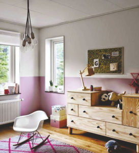 Si el techo de la habitación no está muy alto, pinta 3/4 de la altura de la pared de un color y 1/4 de otro, así parecerá que hay más espacio entre el piso y el techo.
