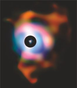 En ésta fotografía vemos la nebulosa compuesta por material arrojado por la estrella, la que se encuentra en el centro de color rojo