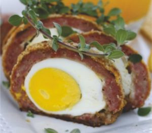 Es un plato de picnic que se come frío. Consiste en un huevo duro recubierto de carne picada.