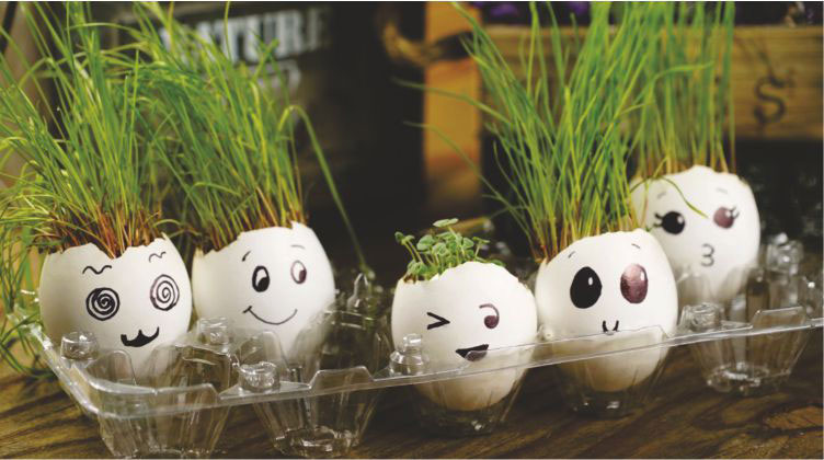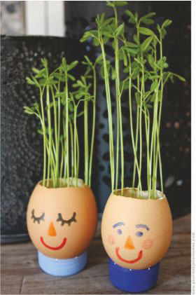 2da. OPCIÓN Cuando vayas a usar huevos de gallina, guarda la cáscara para hacer un germinador. Necesitarás: cáscara de huevo, tierra, semillas y agua. ¿Como se hace? Muy simple, agujereas el huevo por la parte superior, lo vacías, dibujas la carita a tu gusto, colocas tierra, agregas una cucharadita de semillas que pueden ser alpiste, alfalfa, etc, cubres con apenas algo de tierra para que tape las semillas y humedeces, lo colocas en el cartón de huevos o sobre tapitas descartables y lo dejas a la luz dentro de la casa; deberás humedecerlo todos los días. A los pocos días verás los resultados.