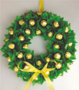 No dejes de sorprender a tus seres queridos con esta simple corona de bombones. Necesitarás un flota flota, servilletas de colores, bandas elásticas, pegamento y cinta para el moño y para colgarla. Formar el aro con el flotador, colocar las servilletas y sobre ellas el bombón (fig.izq.), sujetar por detrás con la goma y pegarlo en el flotador…y a disfrutar!