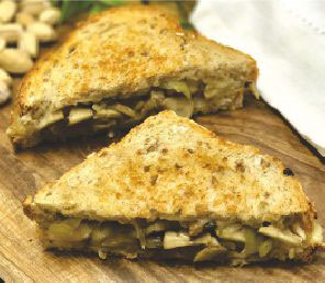 Sofritar en sartén (a fuego bajo) con aceite de oliva caliente, la cebolla picada en trozos con los champiñones laminados, una vez que estén dorados retirar del fuego y reservar. Untar una rebanada de pan de moldo con manteca blanda o mayonesa, colocar en sartén caliente (antiadherente) con la cara untada hacia abajo, encima agregar muzzarela rallada gruesa, encima colocar la mezcla de cebolla y champiñón y más queso rallado, tapar con otra rebanada de pan untada con manteca o mayonesa, con la cara untada hacia afuera. Presionar con cuidado con una espátula para que se integren todos los ingredientes, esperar a que dore el pan de abajo, y con cuidado darla vuelta con espátula hasta que dore el otro pan. Retirar y cortar en triángulo para servir.
