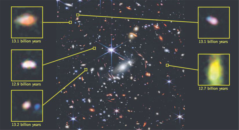 Esta imagen del cúmulo de galaxias SMACS 0723 y sus alrededores fue la primera imagen publicada por el telescopio espacial James Webb en julio de 2022. Los cinco recuadros muestran galaxias de 19.000 años luz de tamaño, observadas tal como eran hace unos 13 mil millones de años. Los primeros resultados del Telescopio Espacial James Webb han insinuado la existencia de galaxias tan tempranas y masivas que entran en conflicto con nuestra comprensión de la formación de estructuras en el Universo. Un nuevo estudio del Cosmic Dawn Center sugiere un efecto que nunca antes se había estudiado en épocas tan tempranas, lo que indica que las galaxias podrían ser aún más masivas. J. Webb sigue poniendo de cabeza varias teorías y abriendo nuevas interrogantes. Fuente Nasa, Esa,CSA y STScI.