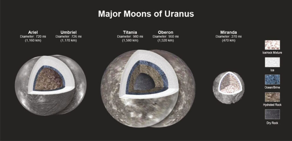 El reanálisis de datos de la nave Voyager, y con modelos nuevos por computadora, ha conducido a científicos de la NASA a concluir que cuatro de las lunas más grandes de Urano contienen una capa oceánica debajo de las cortezas heladas. Al menos 27 lunas orbitan Urano. El trabajo sugiere que Ariel, Umbriel, Titania y Oberón. contienen océanos que podrían tener una profundidad de docenas de kilómetros. FuenteNasa