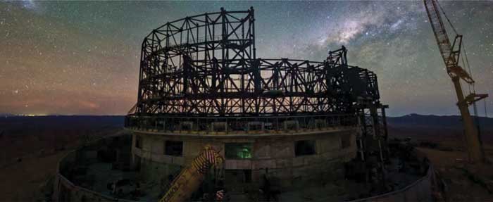 El Extremely Large Telescope (ELT) del Observatorio Europeo Austral (ESO), es un telescopio terrestre revolucionario que tendrá un espejo primario de 39 metros de diámetro, formado por 798 segmentos hexagonales. Será el ojo más grande del mundo para mirar el cielo. Se encuentra en la cima del cerro Armazones, en el desierto de Atacama, Chile. Ingenieros y constructores actualmente están montando la estructura de la cúpula del telescopio a un ritmo asombroso. La estructura de acero cambia de aspecto día a día, pero pronto adquirirá la forma típica de las cúpulas de los telescopios. Se espera que el resto esté culminado en menos tiempo, que la primera parte. Fuente ESO
