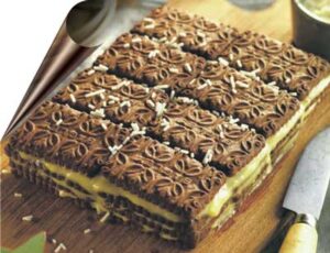Comienza preparando la crema pastelera. Coloca la leche en una olla con la mitad del azúcar y llévala a fuego suave; aparte, en otro recipiente, coloca el resto de azúcar con la maicena y mezcla bien; agrega luego el huevo y la yema y revuelve muy bien de manera que no se formen grumos; añade unas cucharadas de la leche que se está calentando y mezcla bien, luego, vuelca la preparación en la olla y revuelve constantemente para evitar que se formen grumos y verás que empieza a espesar, cocina hasta que obtengas una crema consistente. Aquí tienes 2 opciones, le agregas vainilla y la dejas solo de ese sabor, o la divides en 2 partes y a una le colocas vainilla y a la otra el cacao amargo, en ambos casos mezcla muy bien. Te sugerimos sí, pasarla a un recipiente frío y taparla con papel film (que toque la superficie de la crema para que no se forme una costra). En 1 molde rectangular (a gusto), coloca papel film antiadherente en toda la superficie (esto ayuda a desmoldar la torta una vez fría); y comienza colocando una capa de galletitas, una de crema, otra de galletitas y así sucesivamente hasta terminar con la capa superior de galletitas. Cubre con film y cuando esté a temperatura ambiente, llévalo a la heladera durante algunas horas o de un día hacia el otro. una vez pasado ese tiempo, quita el film superior y desmoldalo sobre una fuente, retira el film y puedes servirlo así o decorarlo con ganache de chocolate. Ganache de chocolate: 250 g chocolate semi amargo y 100 ml de leche. Coloca el chocolate en trozos en un bols (apto para calentar a baño María), agrega la leche sobre el chocolate y lleva a baño María, revolviendo de continuo hasta que el chocolate esté completamente derretido.
